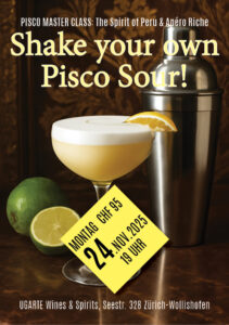 Es freut uns, Ihnen unseren exklusiven Meisterkurs zum Thema Pisco Sour und weitere peruanische Cocktails anzubieten. Tauchen Sie ein in die faszinierende Welt der peruanischen Mixologie und genießen Sie zu jedem Cocktail den passenden Apero Riche, der Ihr Geschmackserlebnis perfekt abrundet. Sichern Sie sich Ihren Platz für dieses einmalige Erlebnis.